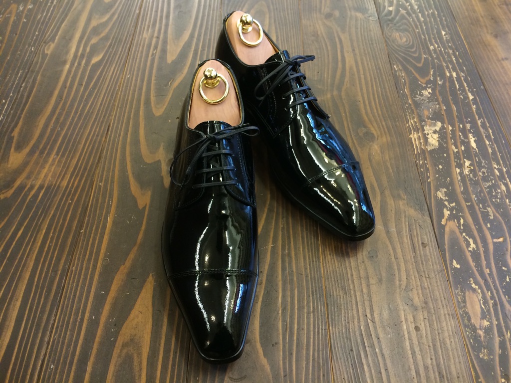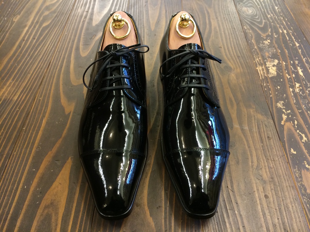 誕生日にプレゼントされた自分では選ばないような黒いエナメルの外羽根ストレートチップ