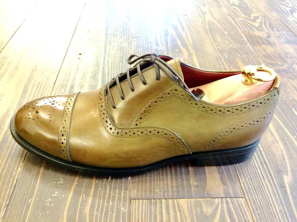 内羽根のストレートチップなのにカーキ系のグラデーションパティーヌなやつ